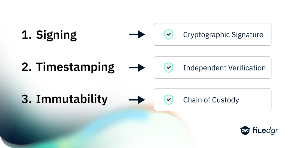 Timestamping: The moment a record is created or modified, it receives an independent timestamp and anchored outside the system that manages the record. This timestamp is verifiable by any party, at any point in the future, without requiring access to the originating system.